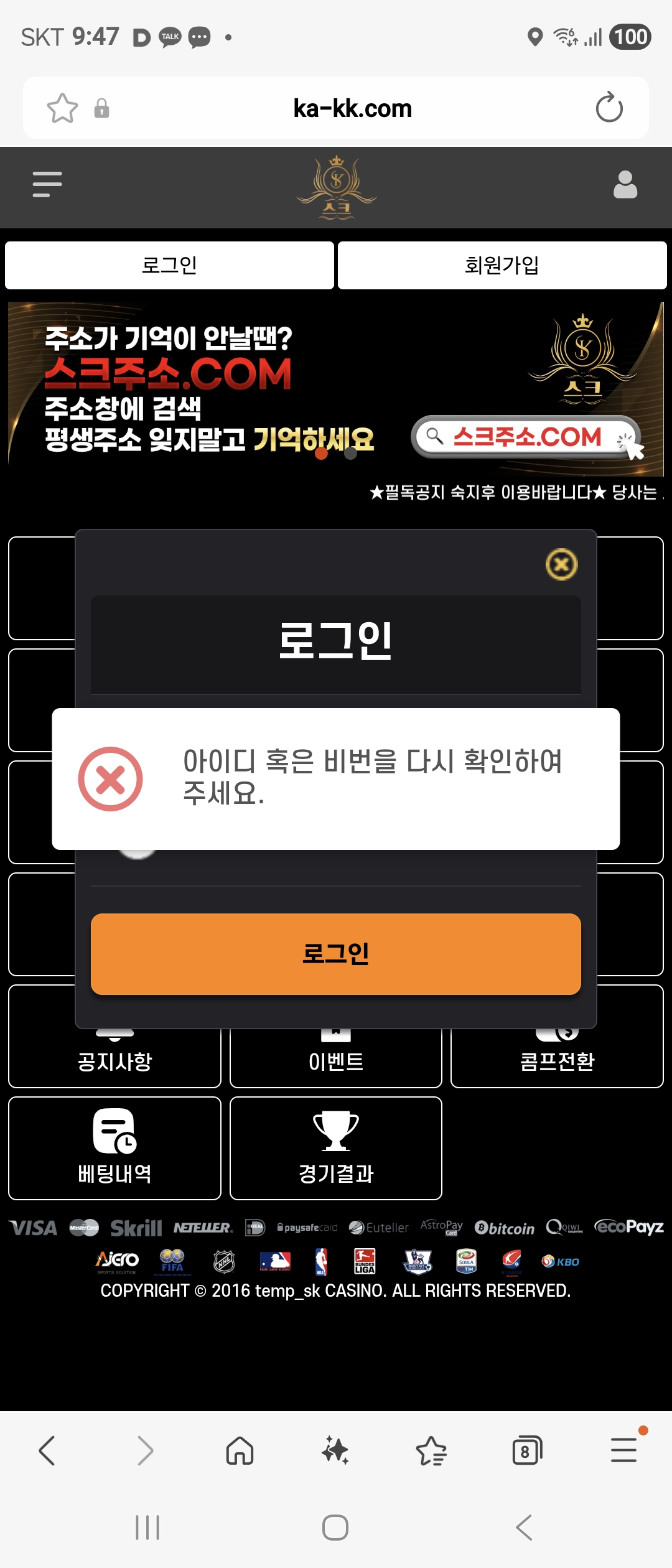 스크카지노 자료 1. 재접속 또는 로그인 불가 상황을 확인하기 위해 제출된 모바일 화면.