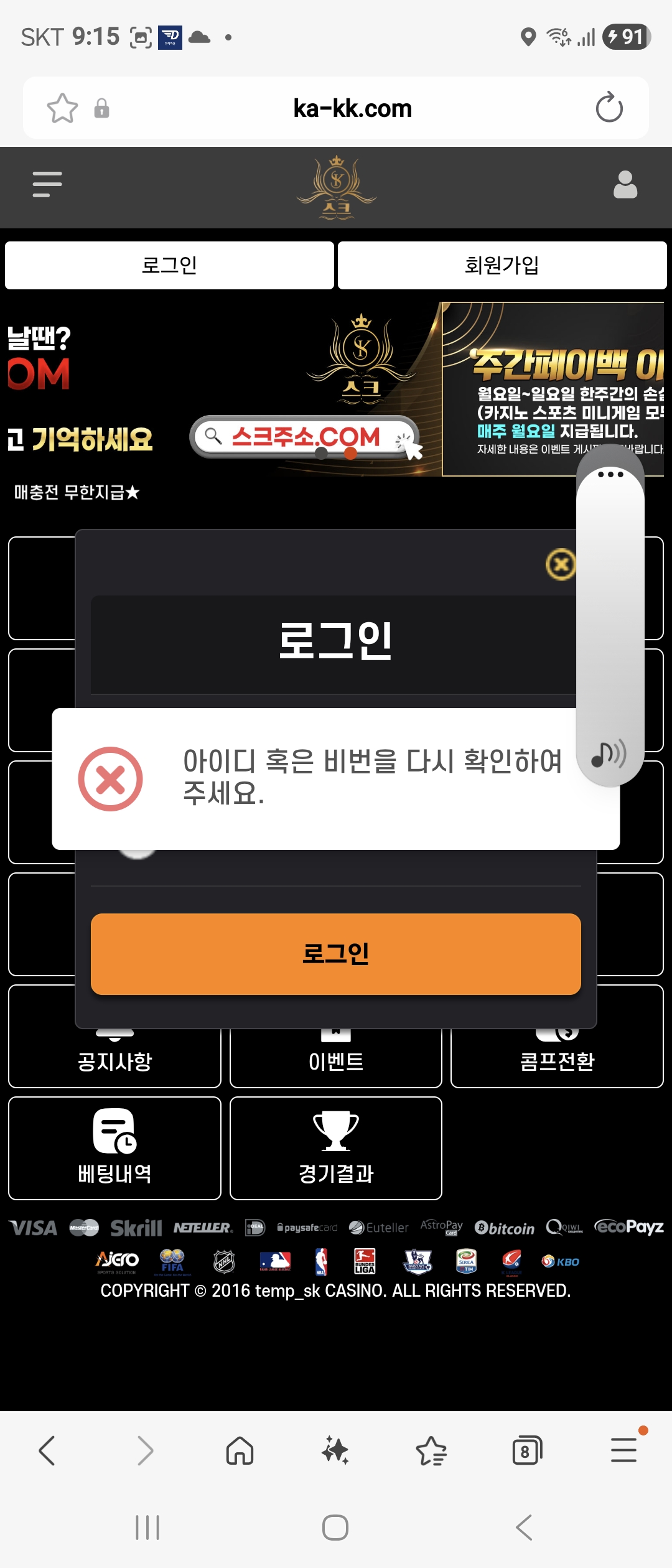 스크카지노 먹튀 제보에서 접속 이상 시점을 기록한 모바일 캡처